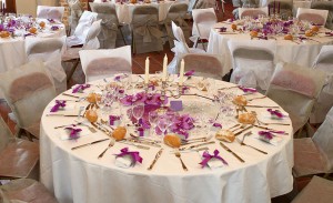 Voici la première question à laquelle vous devrez répondre : souhaitez-vous en mettre plein la vue à vos invités avec de majestueux centres de table hauts ou préférez-vous au contraire la simplicité d’une composition n’obstruant pas la visibilité de vos convives, comme par exemple des coupelles en verre ? Car oui, là se pose le principal soucis du premier cas de figure : les convives placés face à face ne se voient pas. En même temps il y a souvent de la musique pendant une repas de mariage et il sera de toute façon compliqué pour eux de communiquer… Mais certains n’apprécieront pas (ne nous voilons pas la face, ce sont surtout les parents et les grand-parents que cela dérange) de ne pas pouvoir avoir une vue d’ensemble sur les personnes à leur table et c’est une objection à prendre en compte. Il ne vous laissera alors qu’à vous rabattre sur des centres de table bas permettant à l’ensemble de la tablée de communiquer… ne serait-ce que par le regard ou par les gestes !